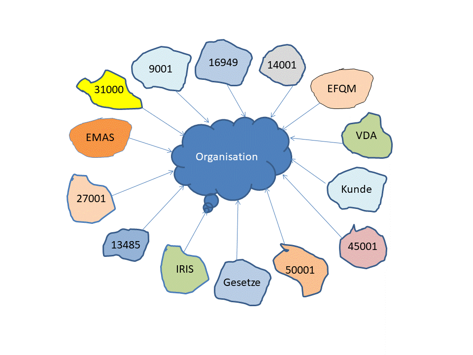 Jede Organisation ist ständig mit internen und externen Anforderungen an das Managementsystem konfrontiert, die u.a. aus der eigenen Zielsetzung, aus Gesetzen, Normen oder Kundenwünschen resultieren. Diese in einem Managementsystem zusammenzufassen, ist die besondere Herausforderung unserer Zeit.